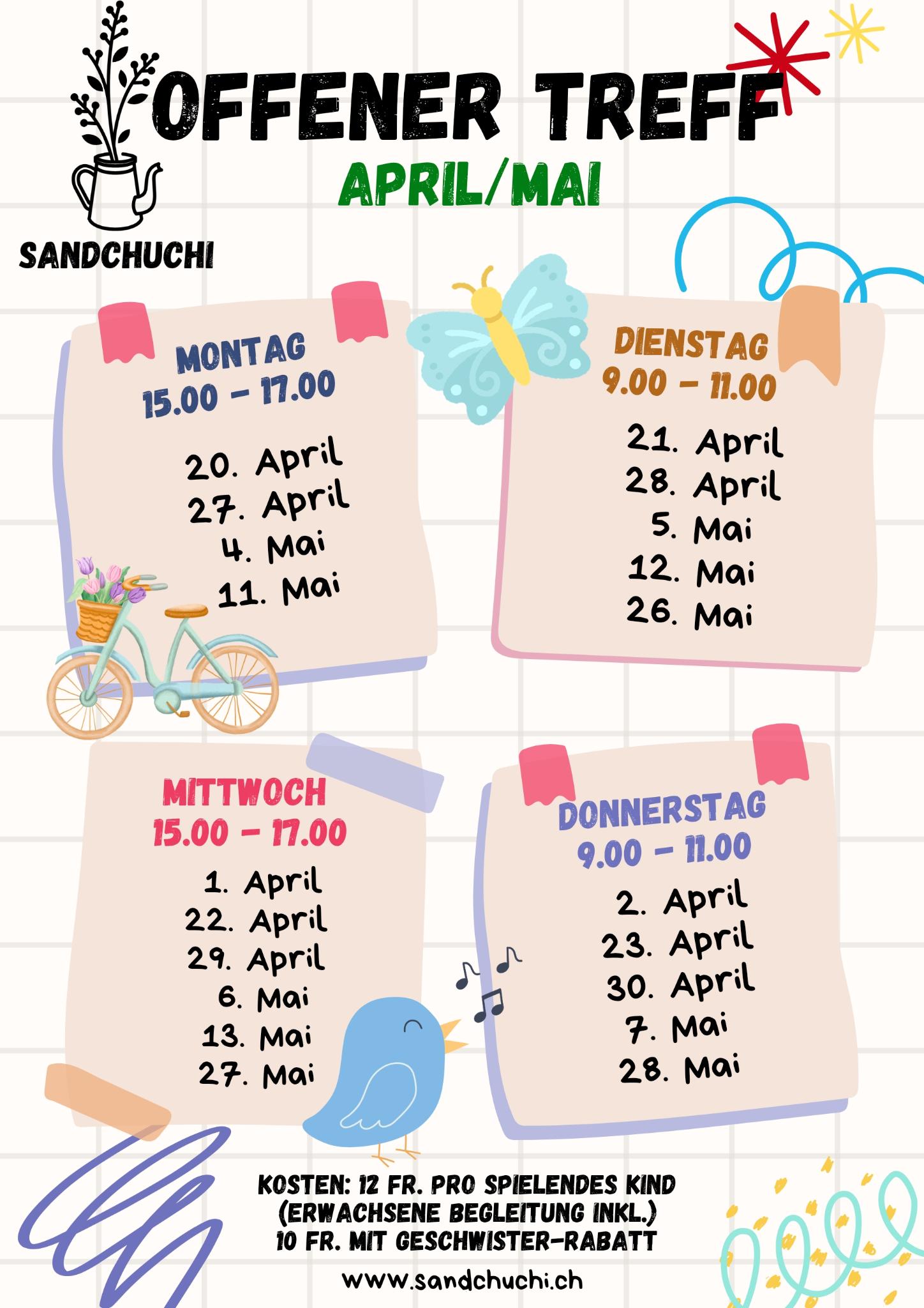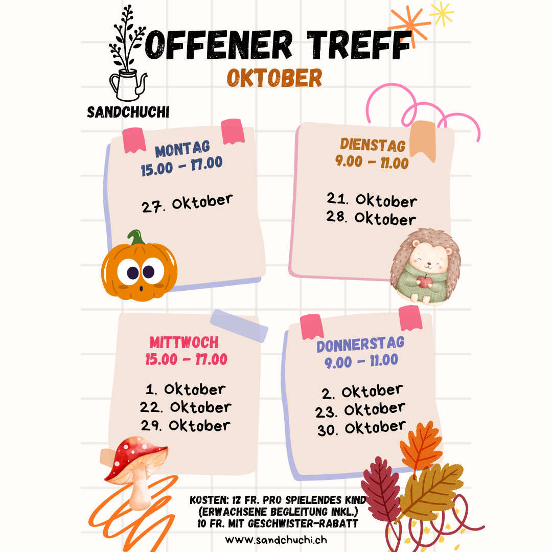 Mehrmals in der Woche könnt ihr ganz ungezwungen die Sandchuchi besuchen. An den offenen Treffs dürft ihr spontan vorbeikommen und den Spielraum geniessen.