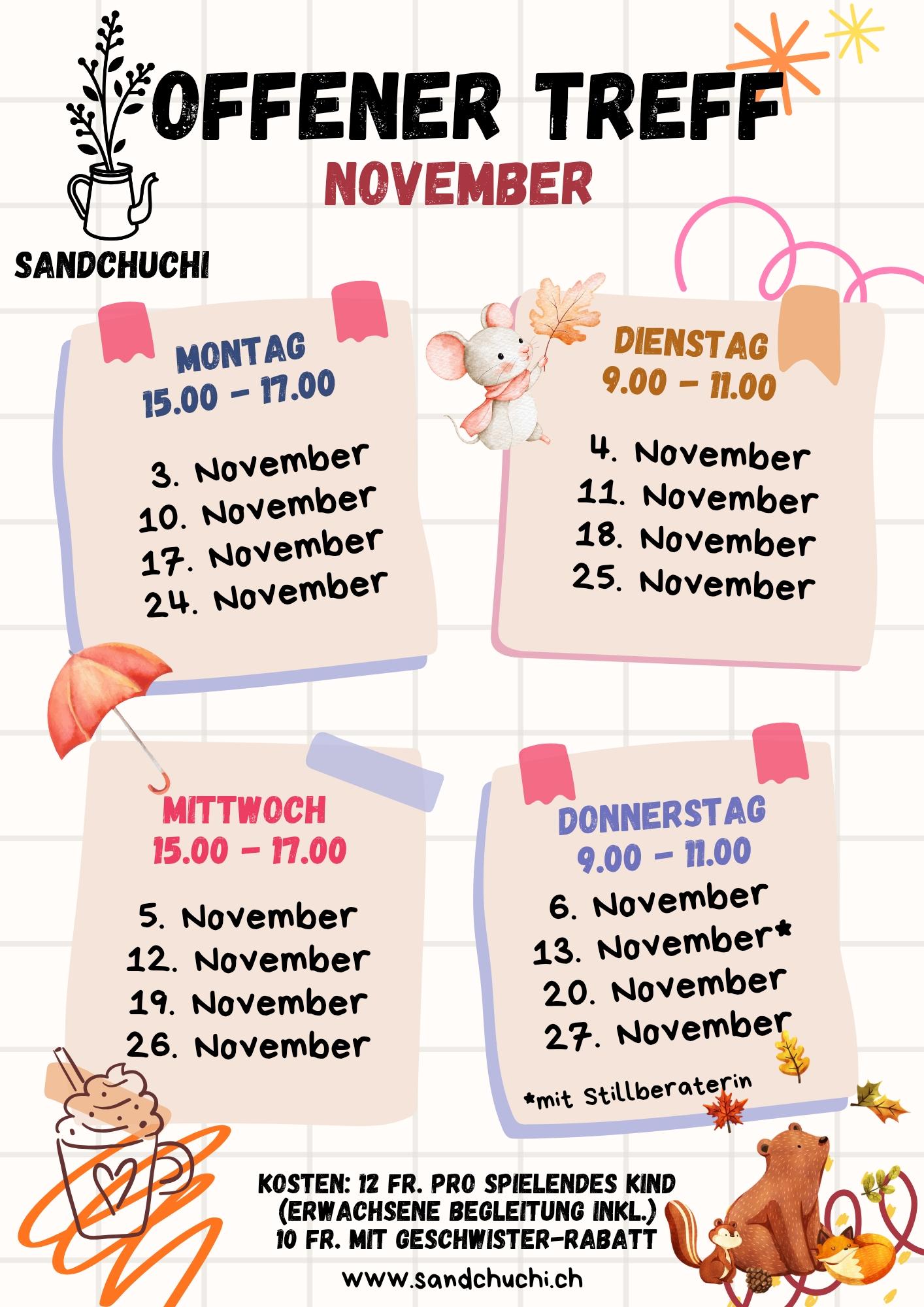 Mehrmals in der Woche könnt ihr ganz ungezwungen die Sandchuchi besuchen. An den offenen Treffs dürft ihr spontan vorbeikommen und den Spielraum geniessen.