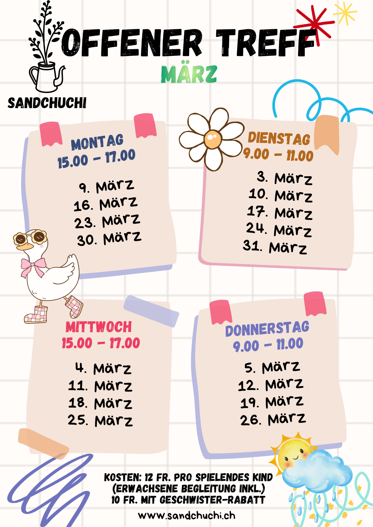 - Geschwister-Rabatt: CHF 10.00 pro spielendes Kind